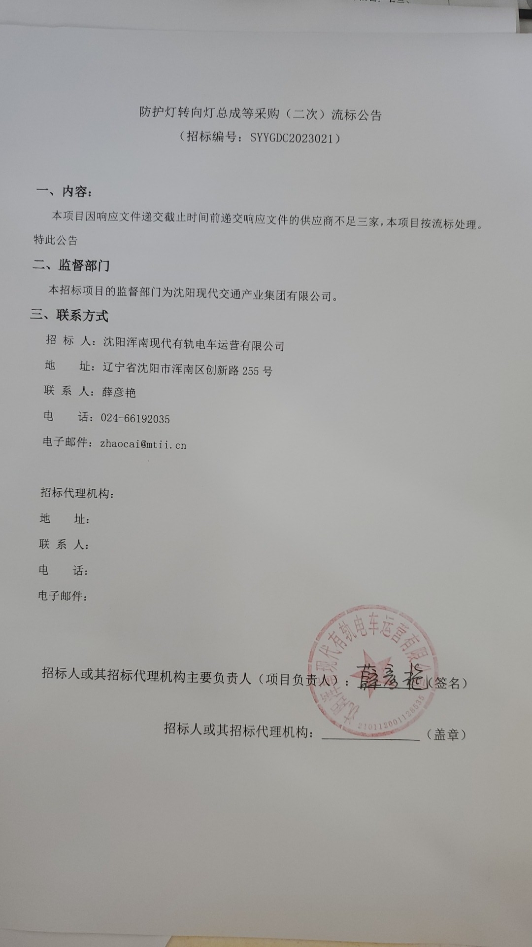 防护灯转向灯总成等采购(二次)流标公告