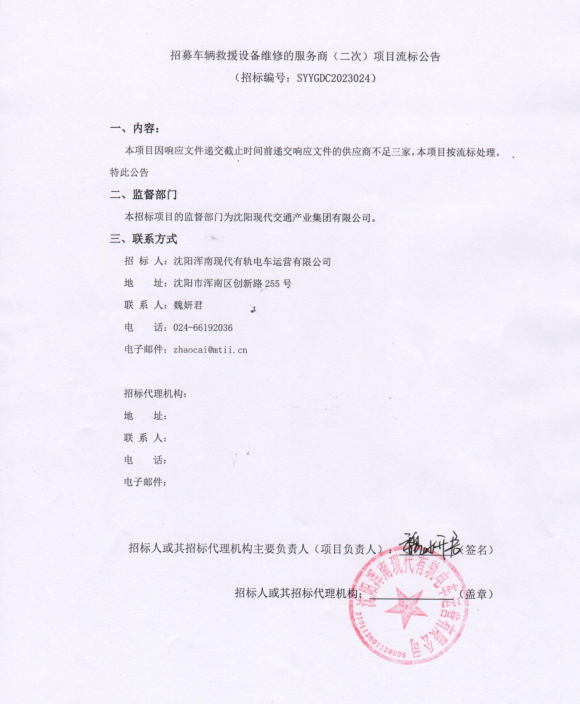 招募车辆救援设备维修的服务商(二次)项目流标公告