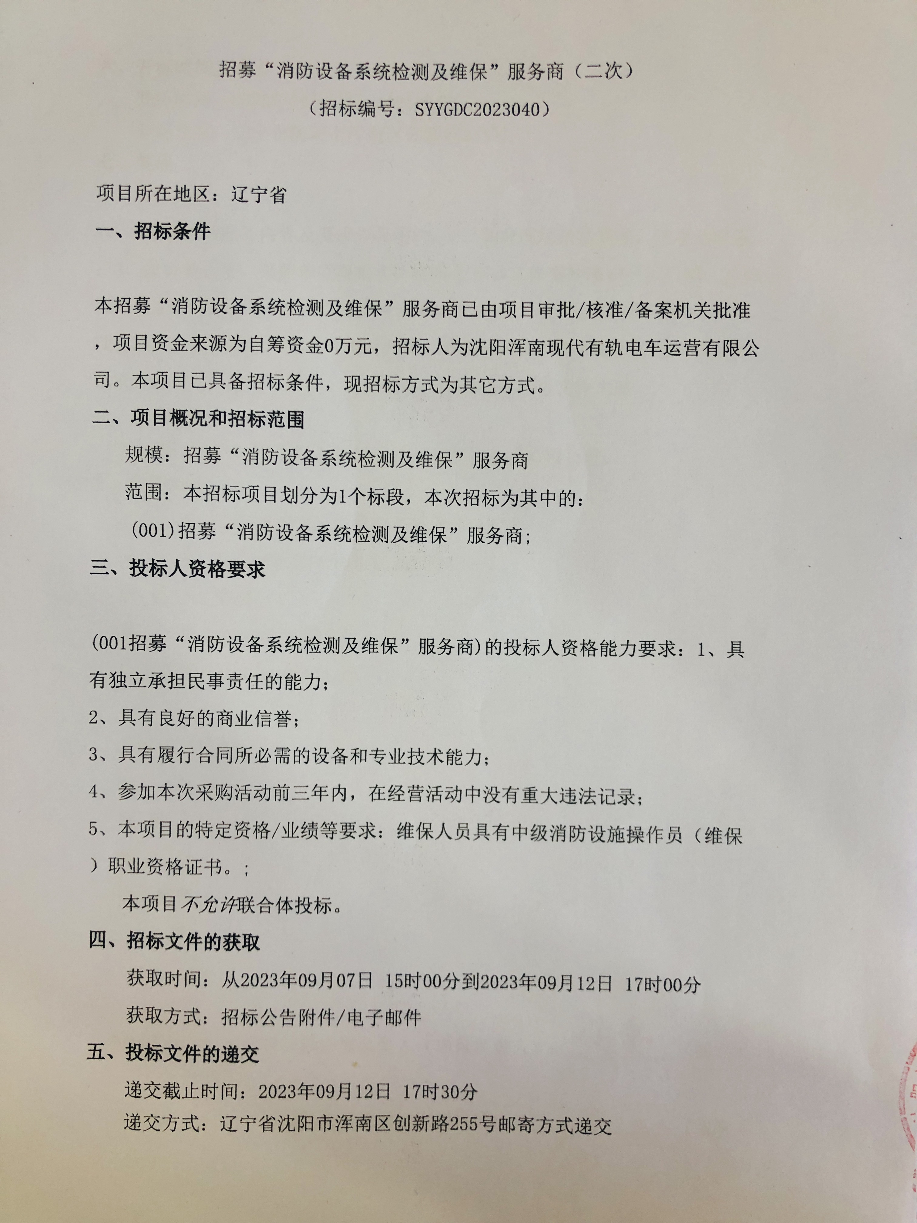 招采公告-招募“消防设备系统检测及维保”服务商(二次)