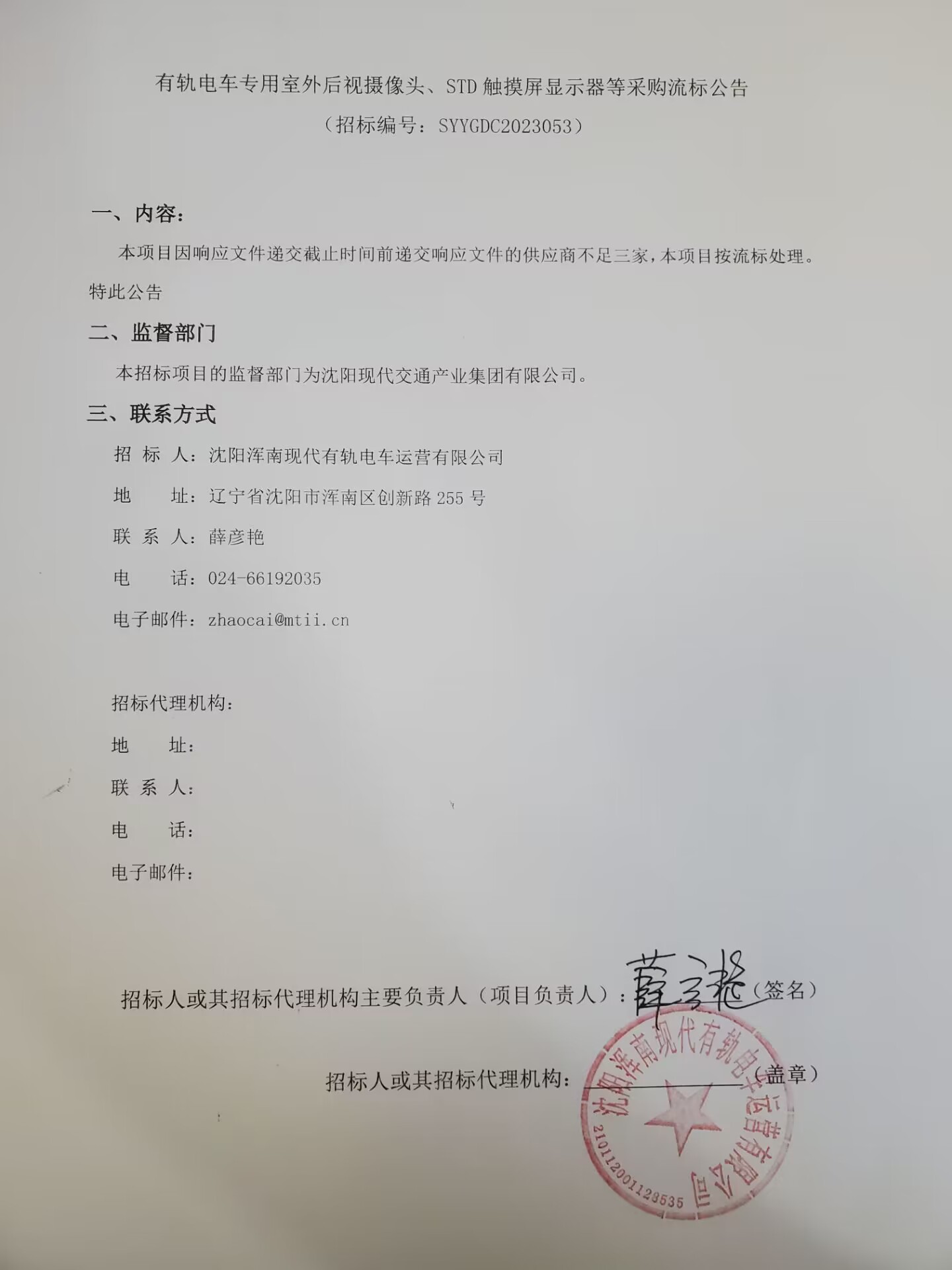 有轨电车专用室外后视摄像头、STD触摸屏显示器等采购流标公告