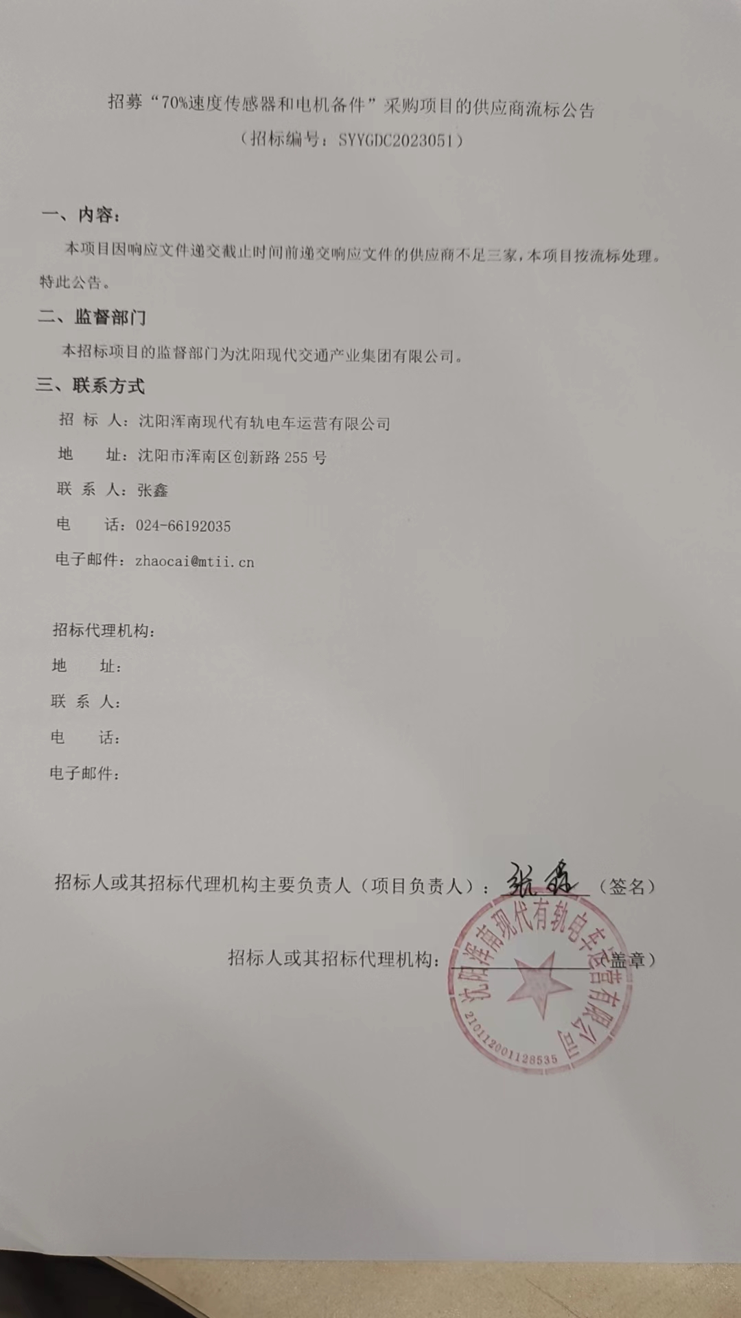 招募“70%速度传感器和电机备件”采购项目的供应商流标公告