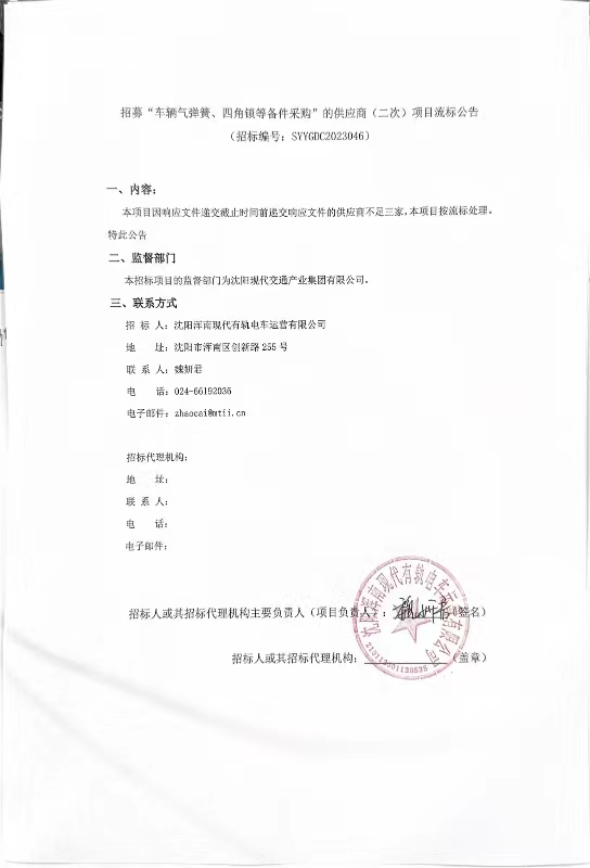 招募“车辆气弹簧、四角锁等备件采购”的供应商(二次)项目流标公告