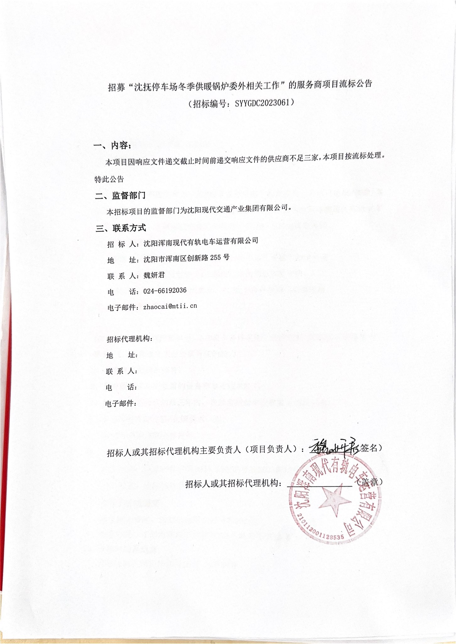 招募“沈抚停车场冬季供暖锅炉委外相关工作”的服务商项目流标公告