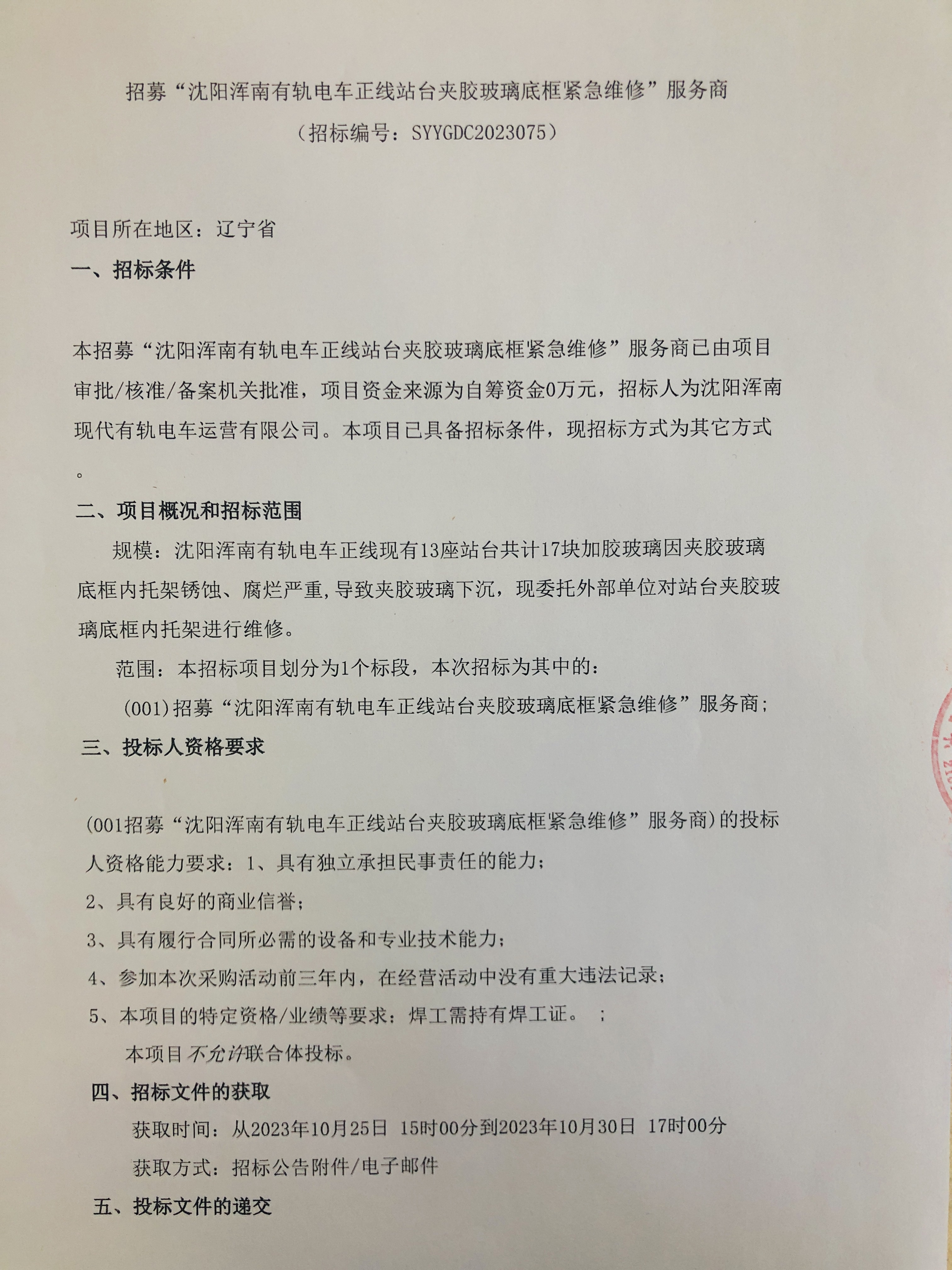 附件-招募“沈阳浑南有轨电车正线站台夹胶玻璃底框紧急维修”服务商