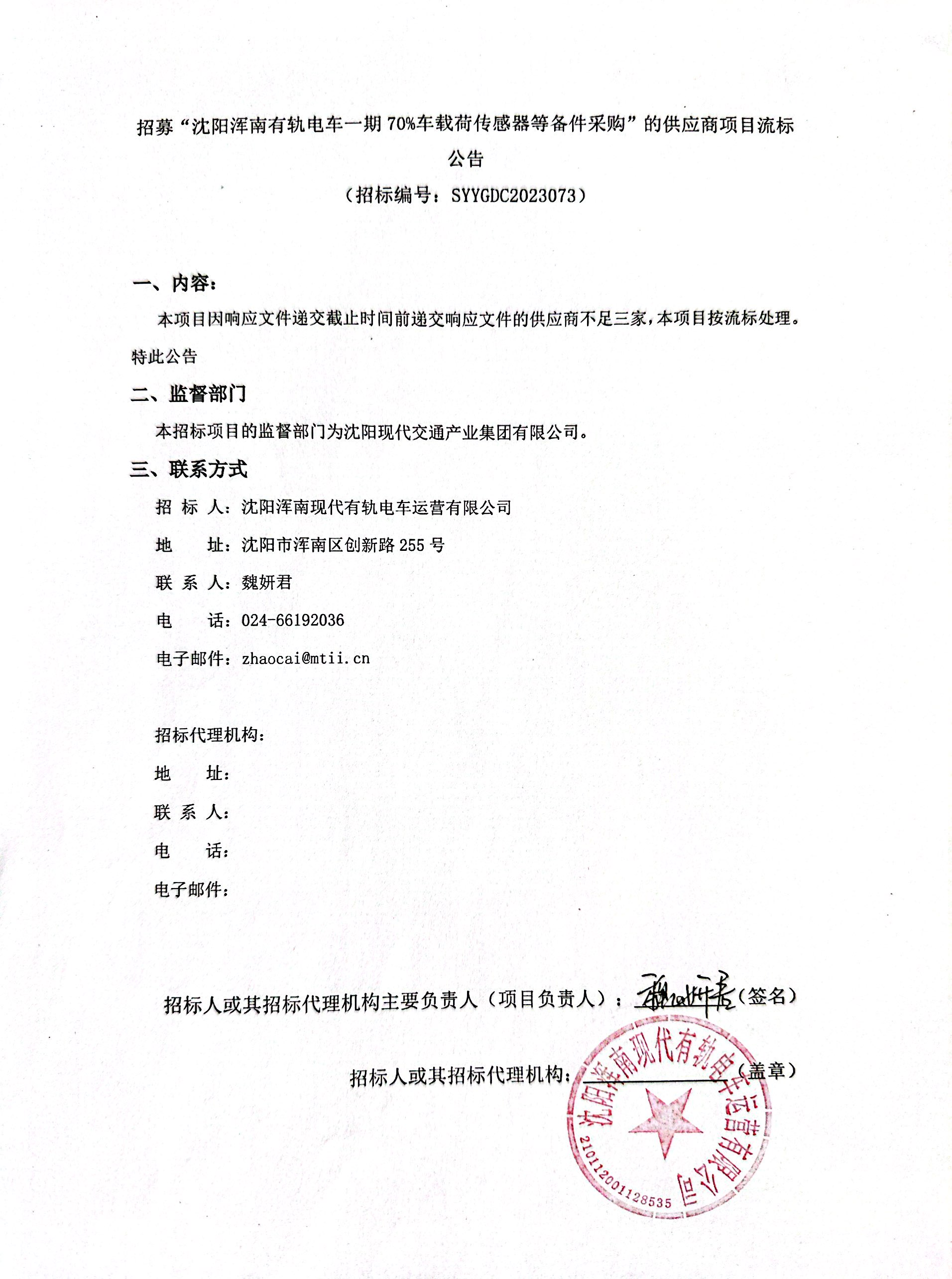 招募“沈阳浑南有轨电车一期70%车载荷传感器等备件采购”的供应商项目流标公告