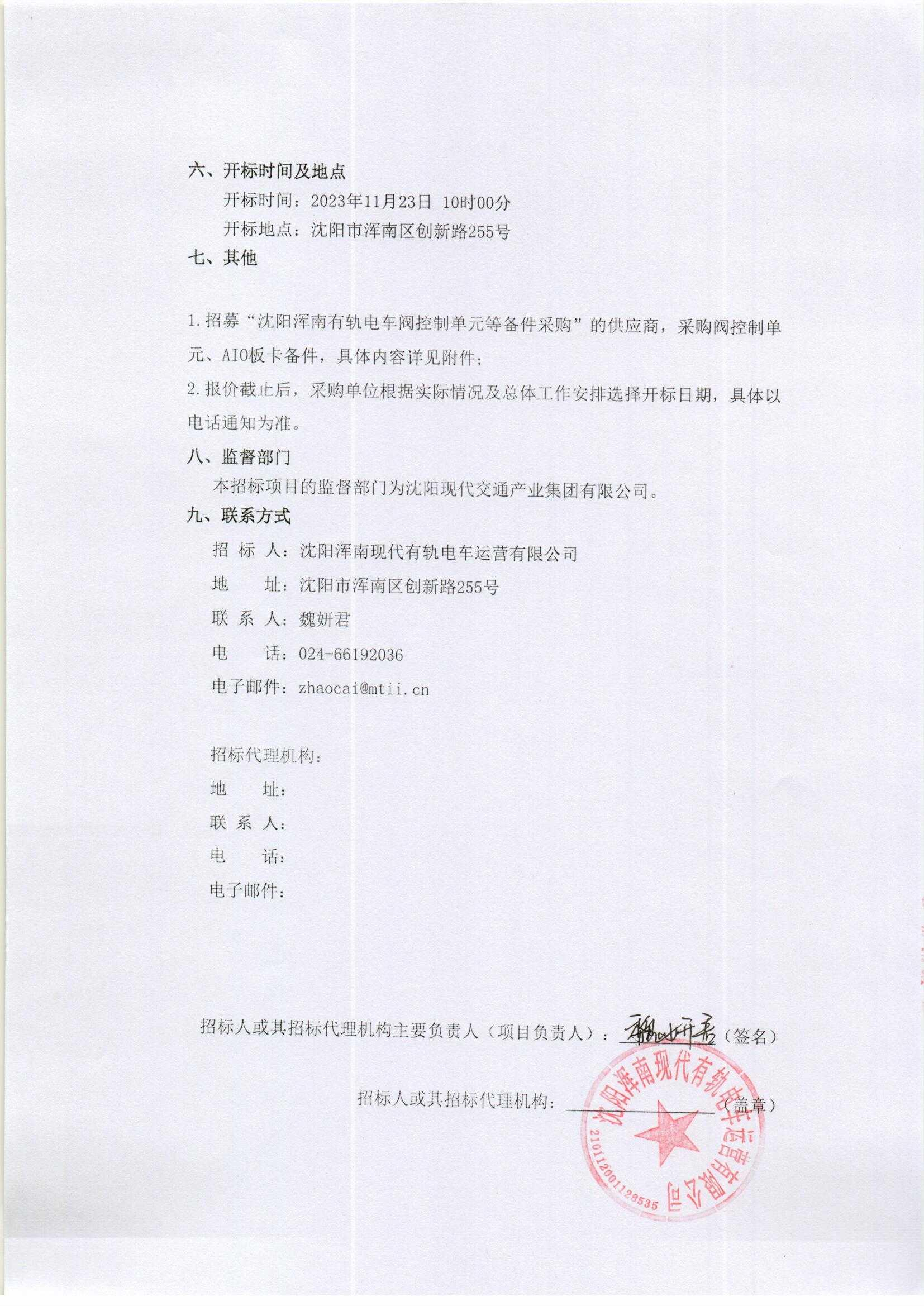 招采公告-招募“沈阳浑南有轨电车阀控制单元等备件采购”的供应商(二次)