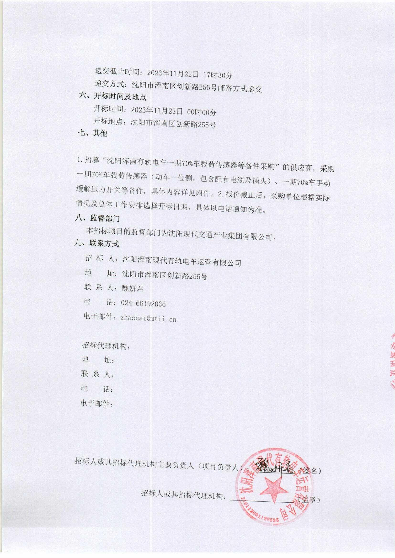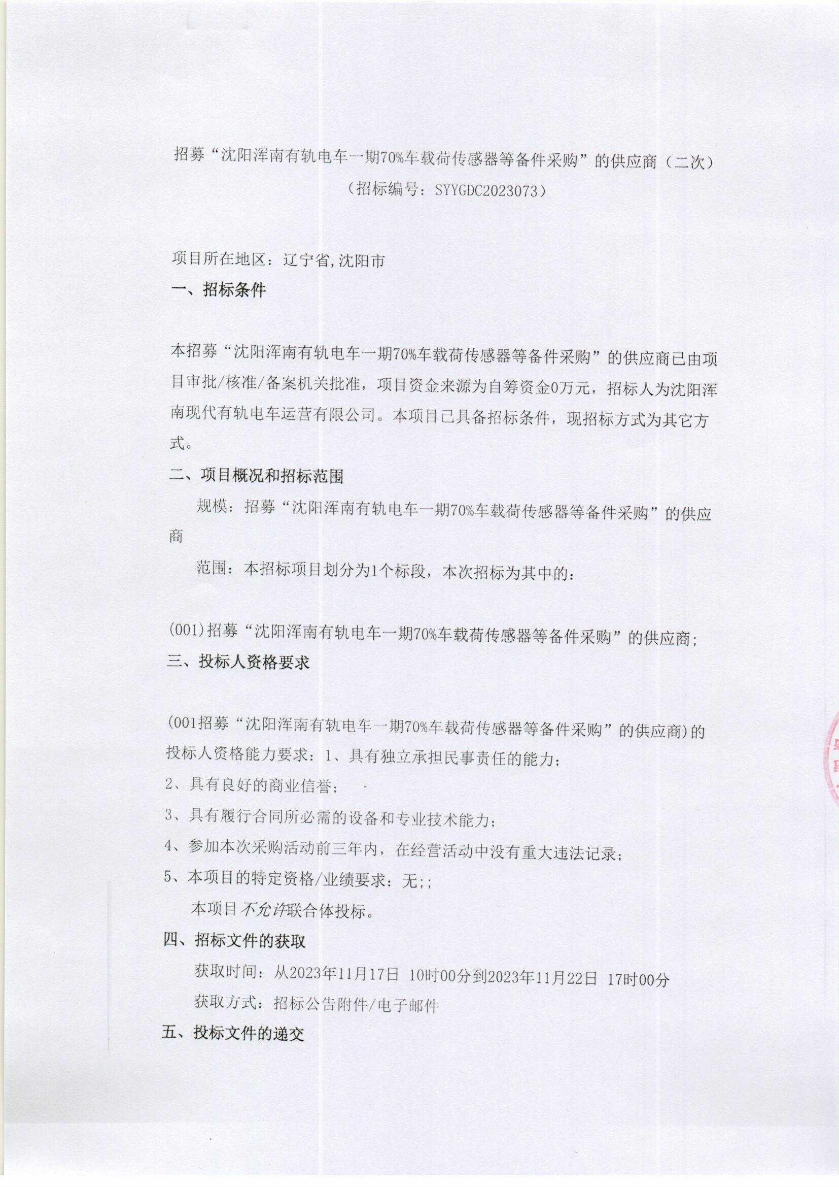 招募“沈阳浑南有轨电车一期70%车载荷传感器等备件采购”的供应商-递交文件模版及相关说明