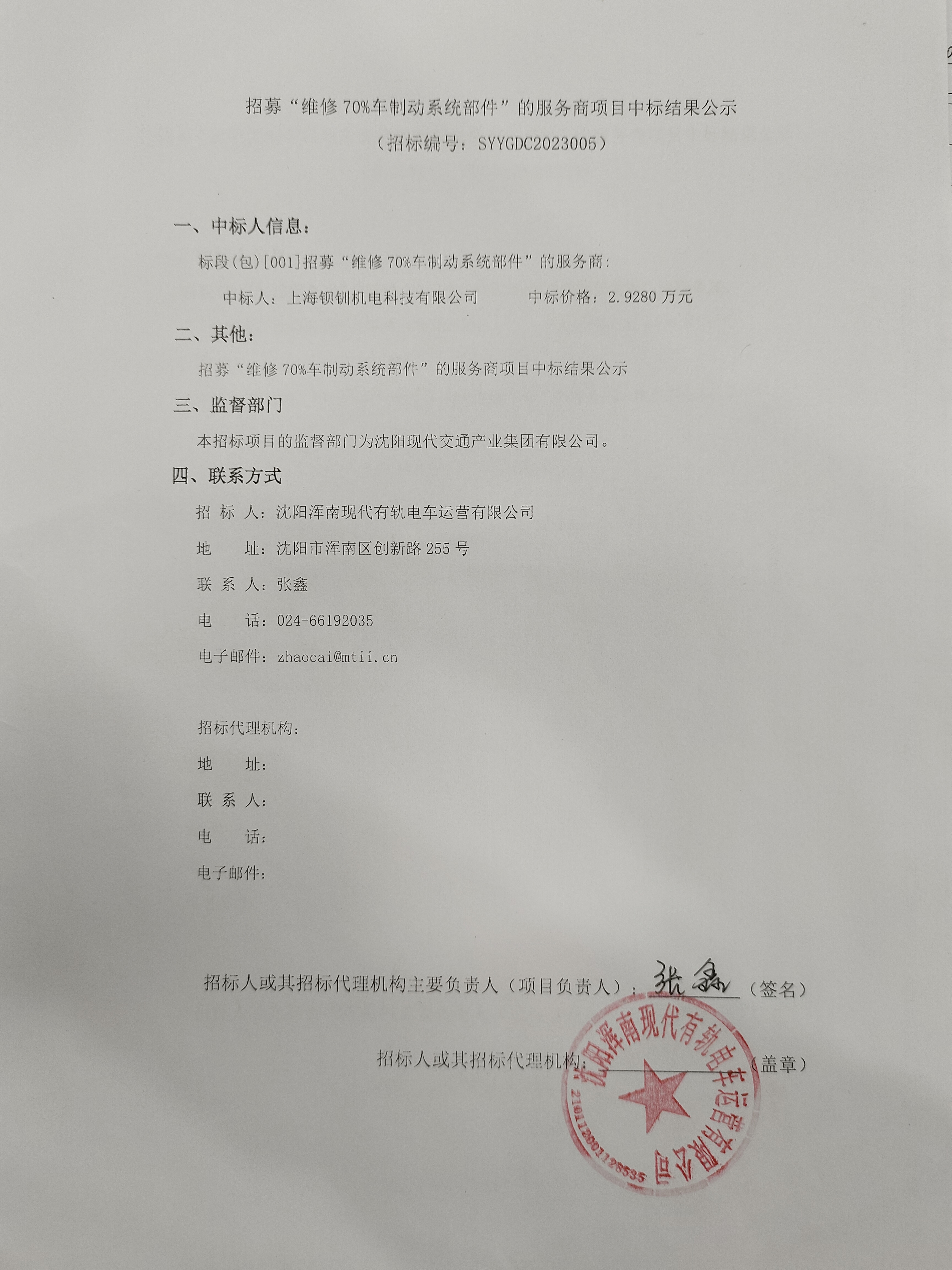 招募“维修70%车制动系统部件”的服务商项目中标结果公示