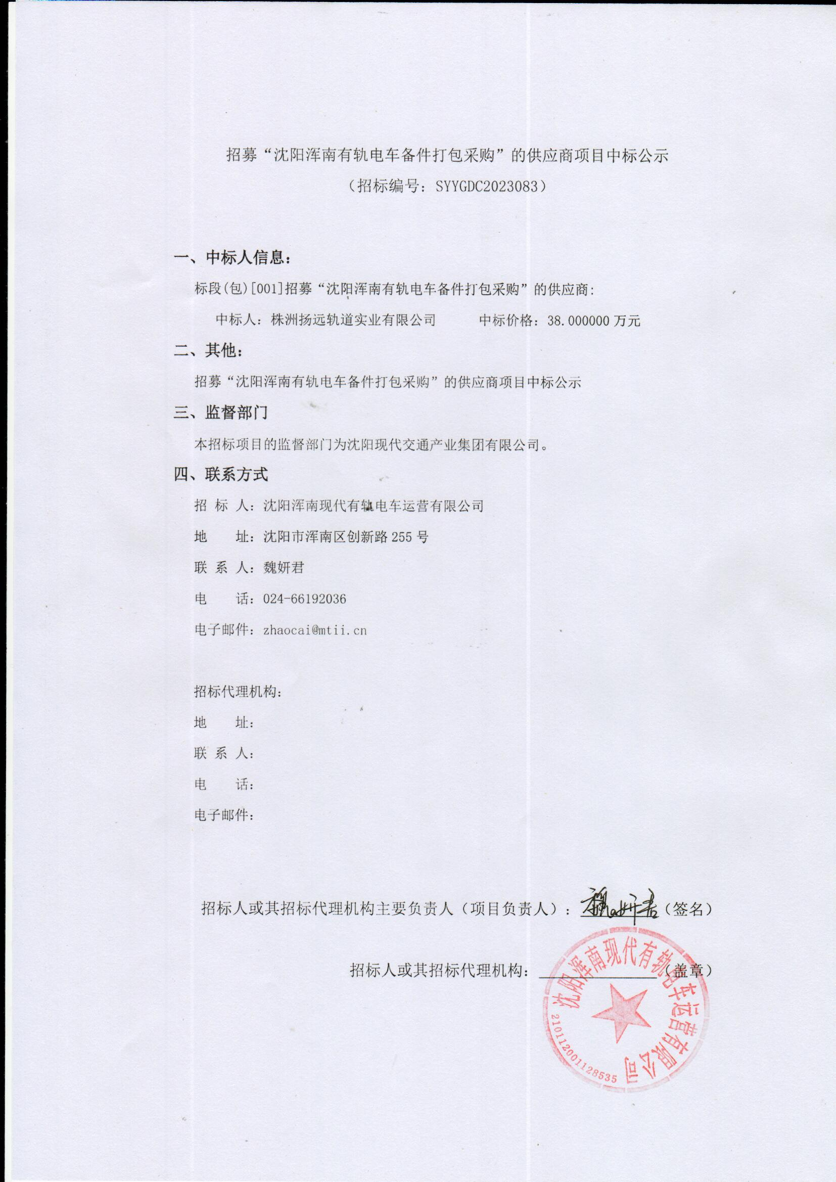 招募“沈阳浑南有轨电车备件打包采购”的供应商项目中标公示