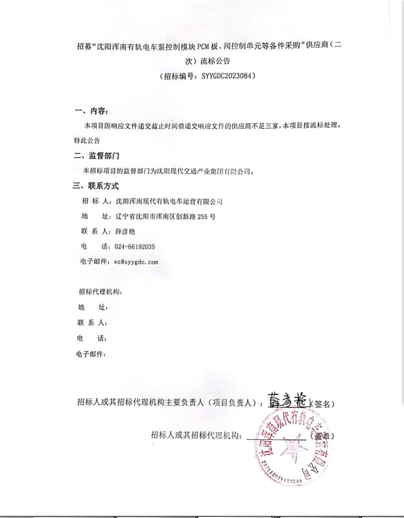 招募“沈阳浑南有轨电车泵控制模块PCM板、阀控制单元等备件采购”供应商(二次)流标公告