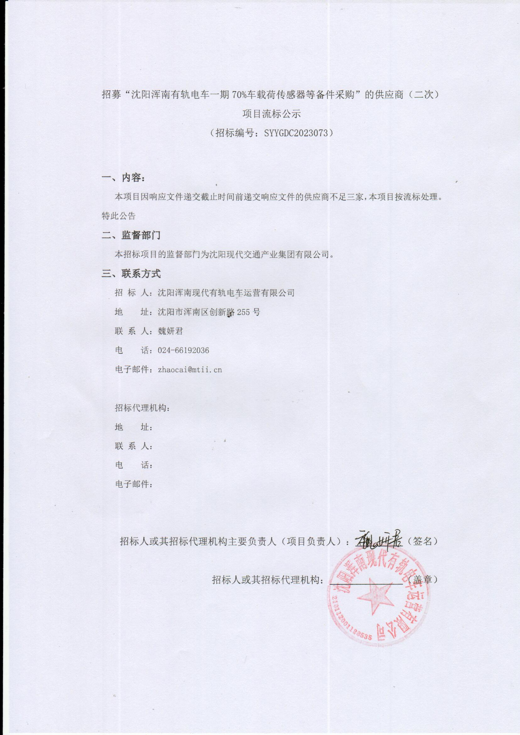 招募“沈阳浑南有轨电车一期70%车载荷传感器等备件采购”的供应商(二次)项目流标公示