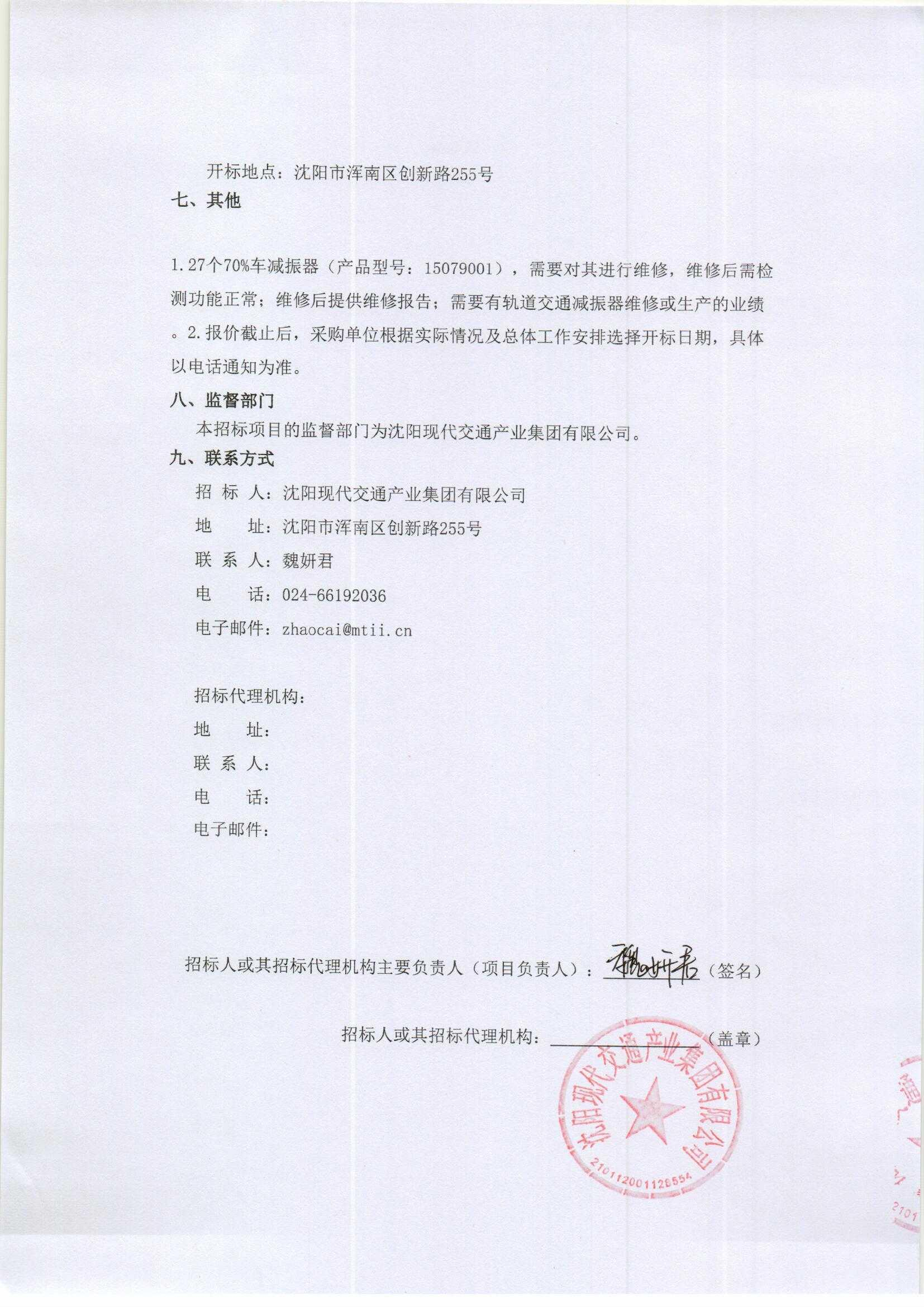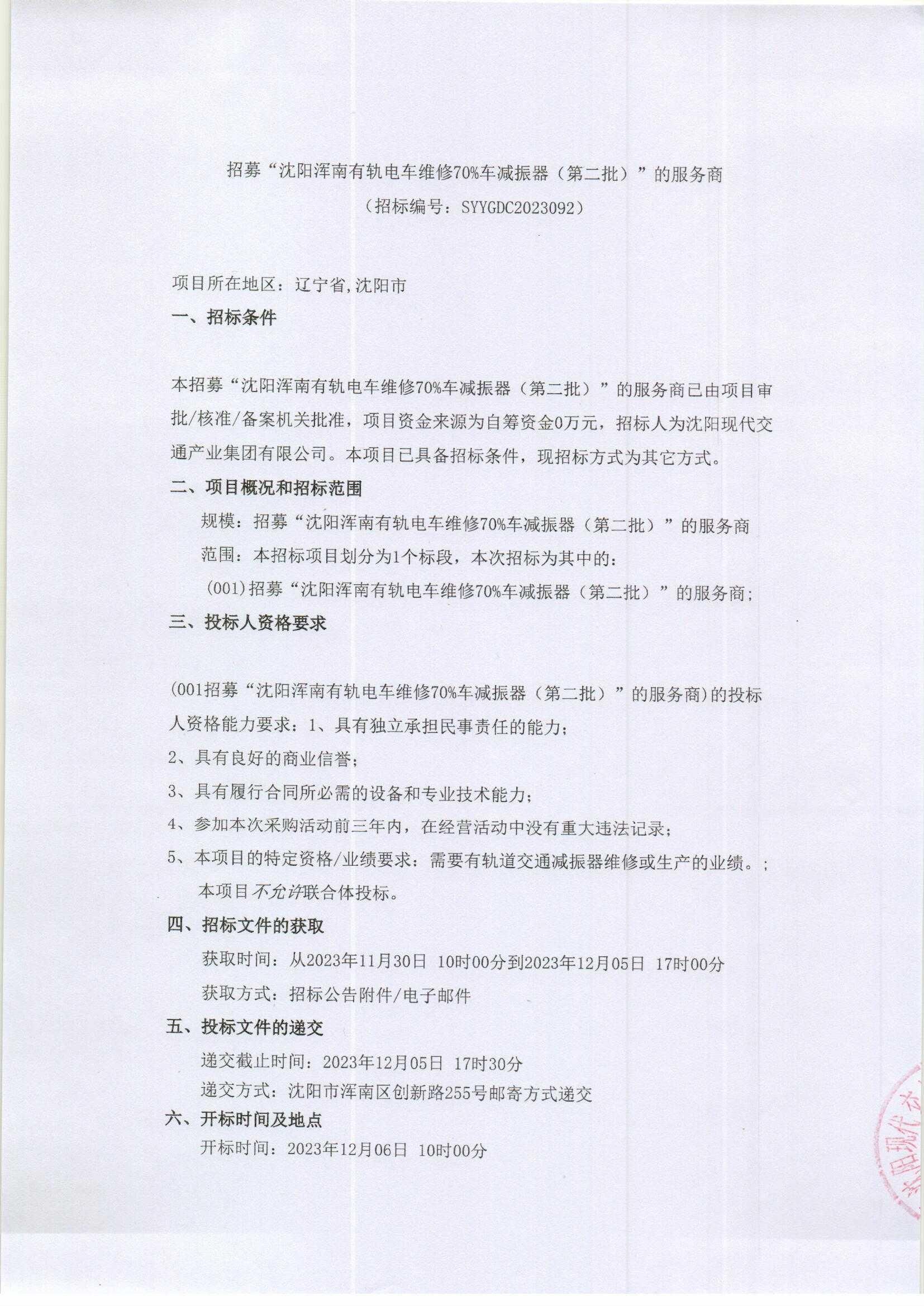 招采公告1-招募“沈阳浑南有轨电车维修70%车减振器(第二批)”的服务商