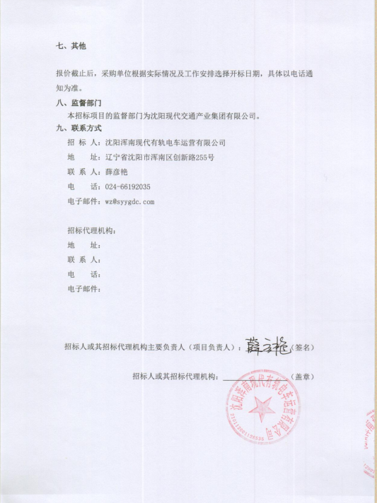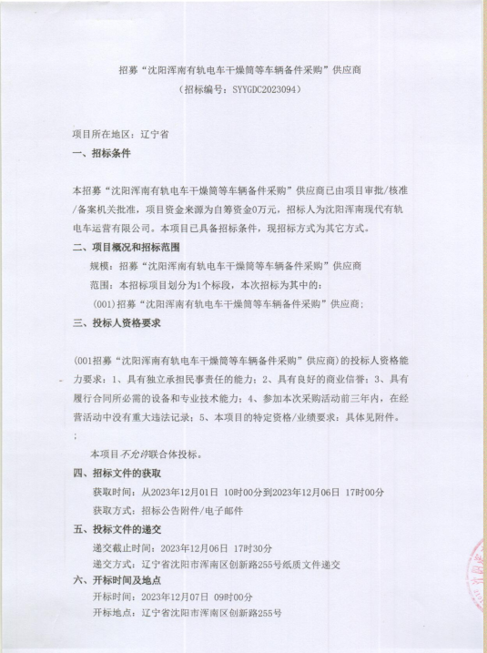 招采公告-招募“沈阳浑南有轨电车干燥筒等车辆备件采购”供应商