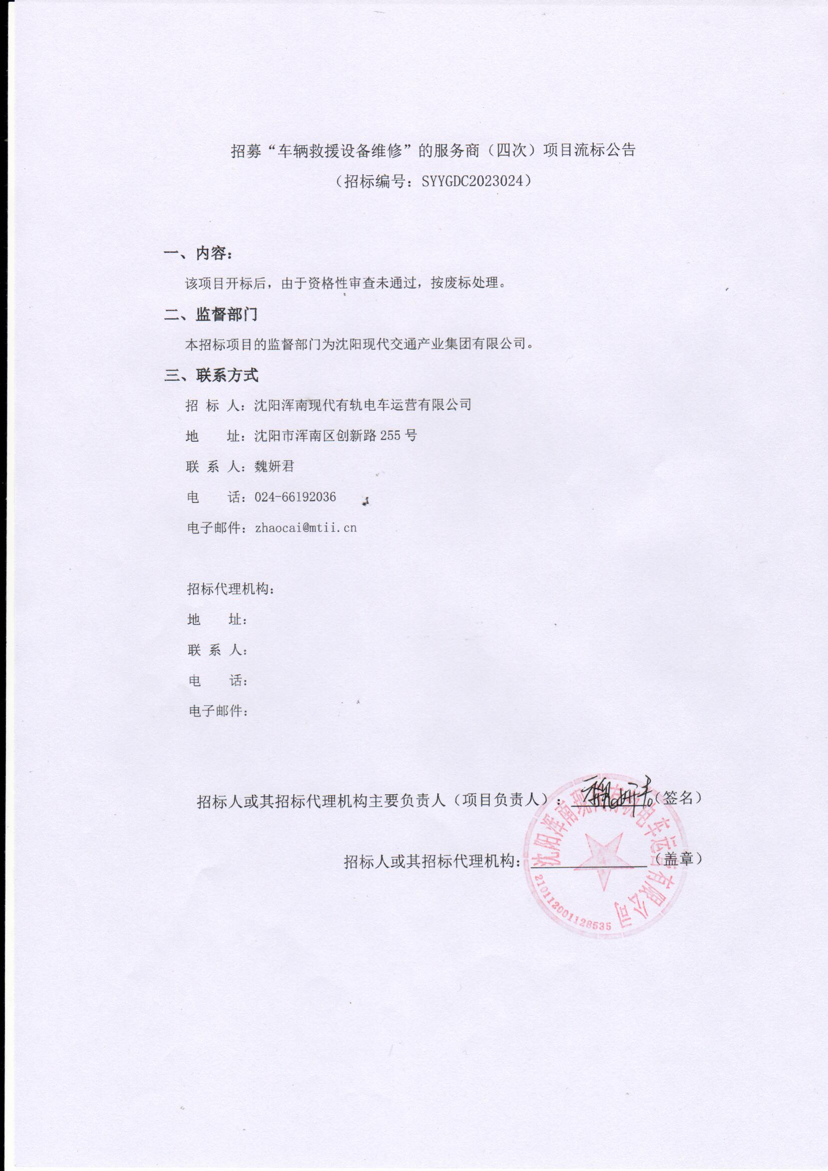 招募“车辆救援设备维修”的服务商(四次)项目流标公告
