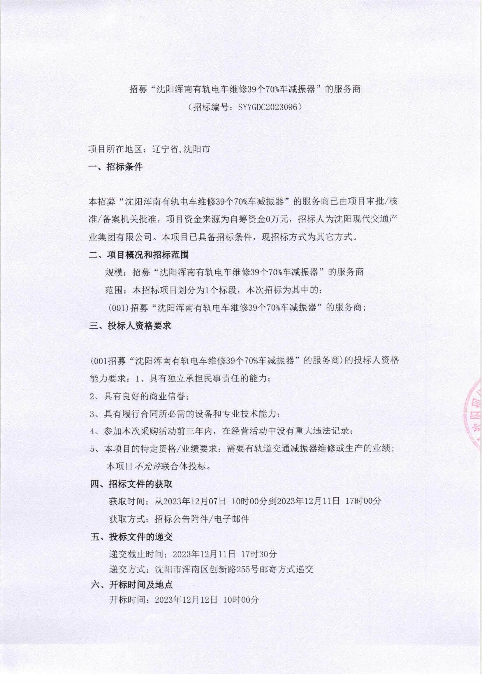 招采公告-招募“沈阳浑南有轨电车维修39个70%车减振器”的服务商