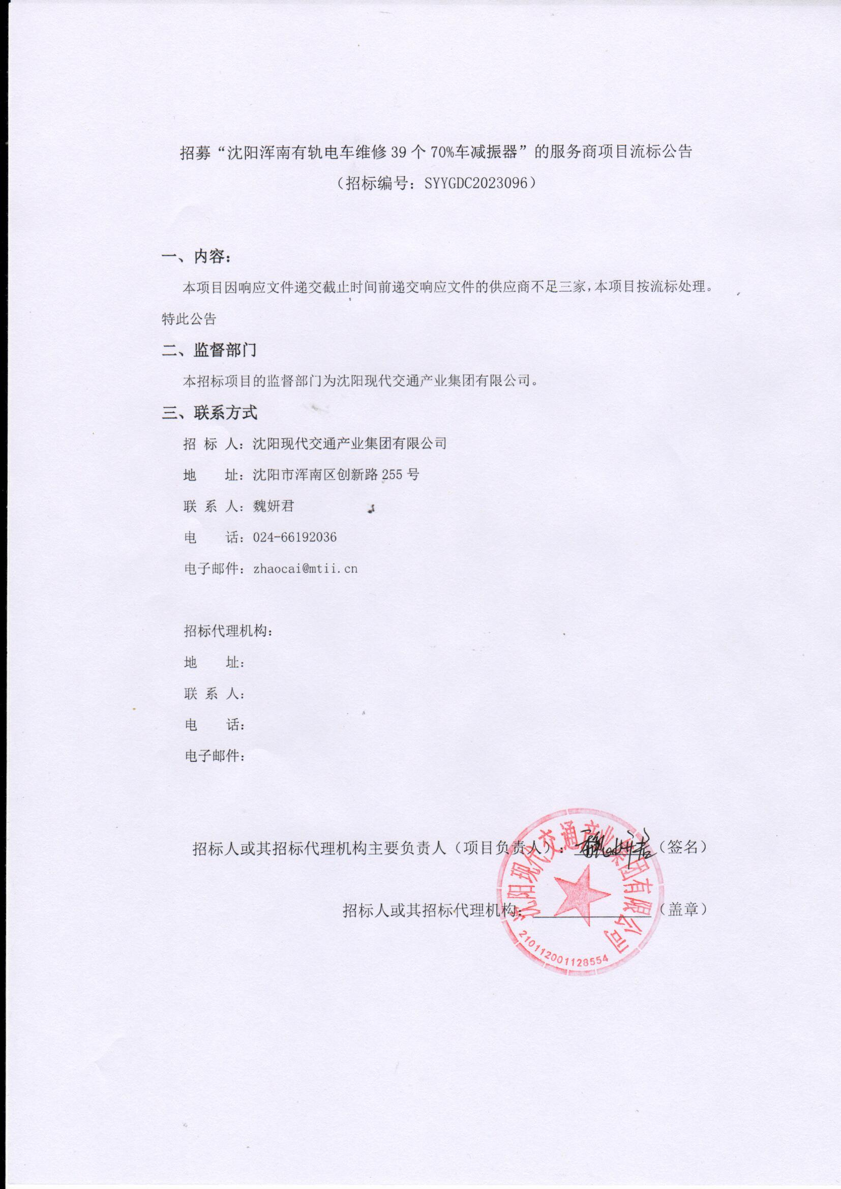 招募“沈阳浑南有轨电车维修39个70%车减振器”的服务商项目流标公告