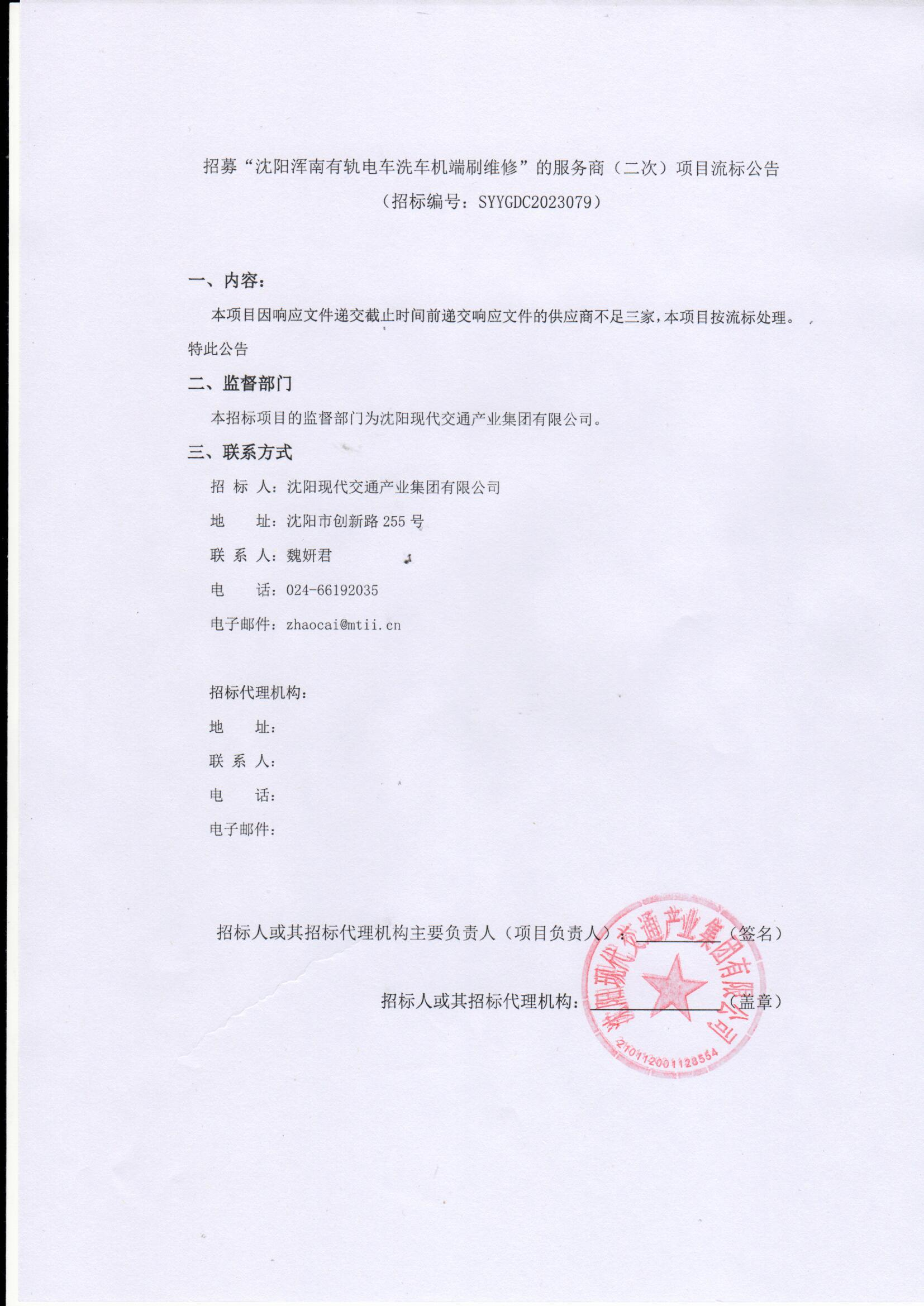 招募“沈阳浑南有轨电车洗车机端刷维修”的服务商(二次)项目流标公告
