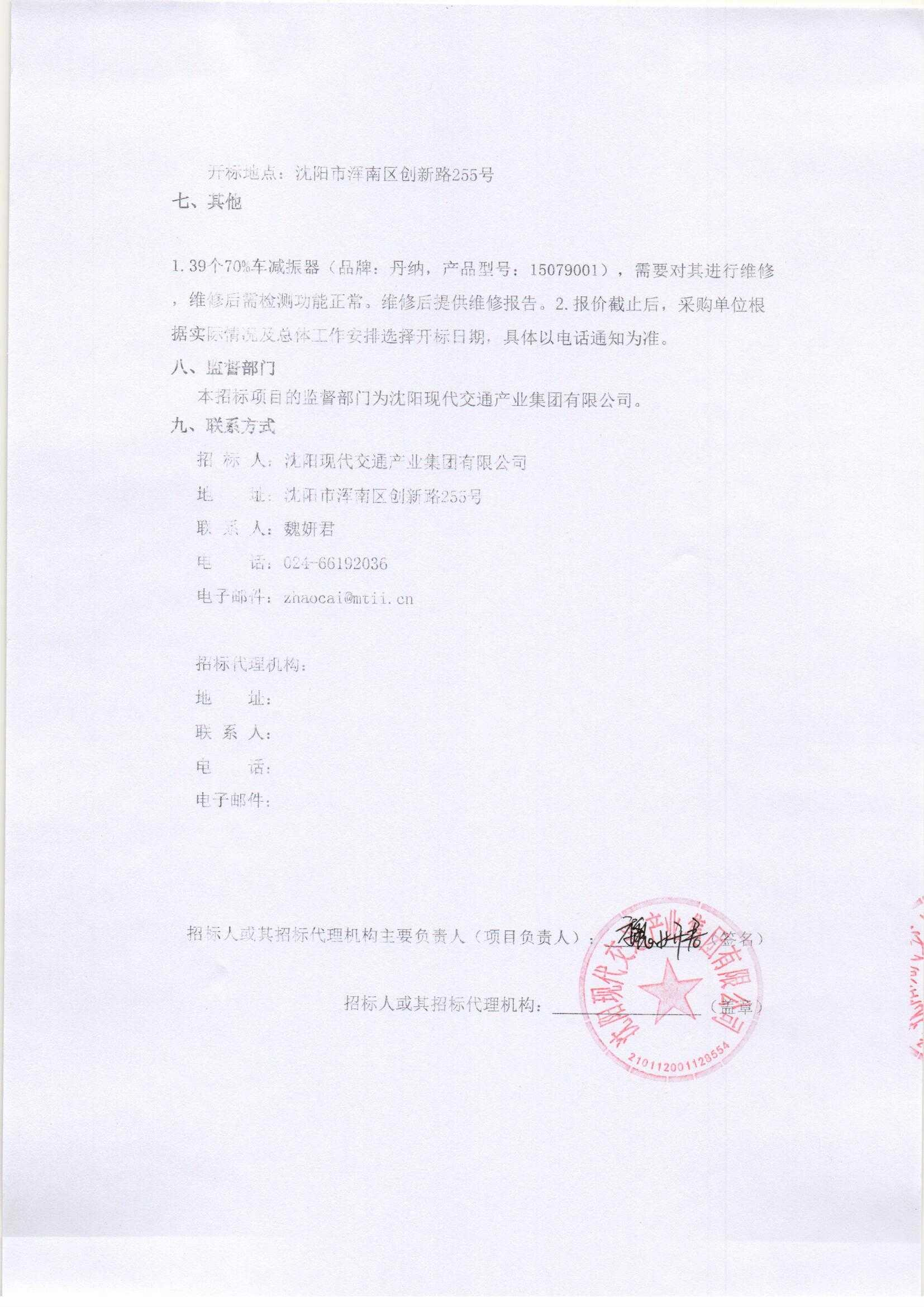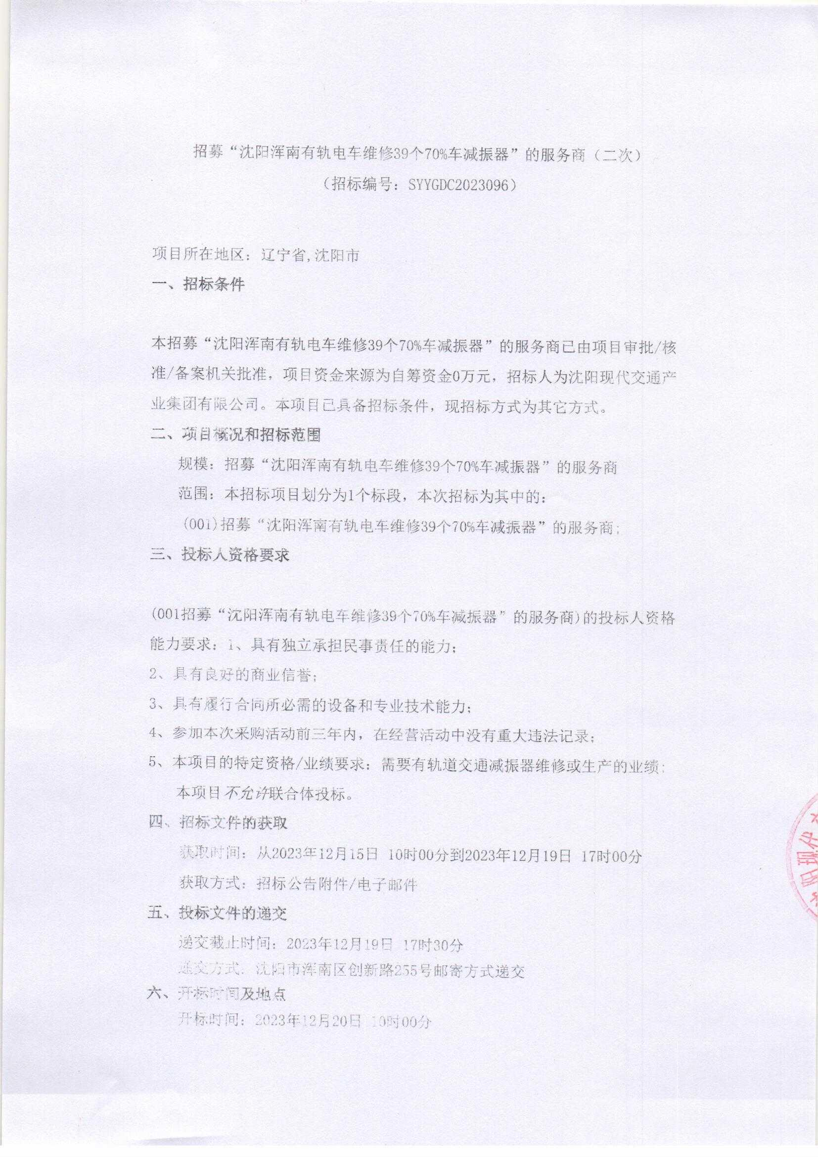 招采公告1-招募“沈阳浑南有轨电车维修39个70%车减振器”的服务商(二次)