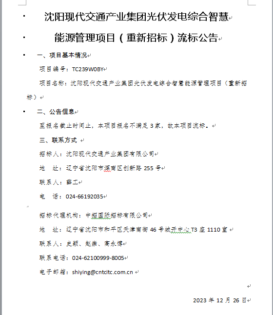 招采公告-沈阳现代交通产业集团光伏发电综合智慧能源管理项目(重新招标)的流标公告