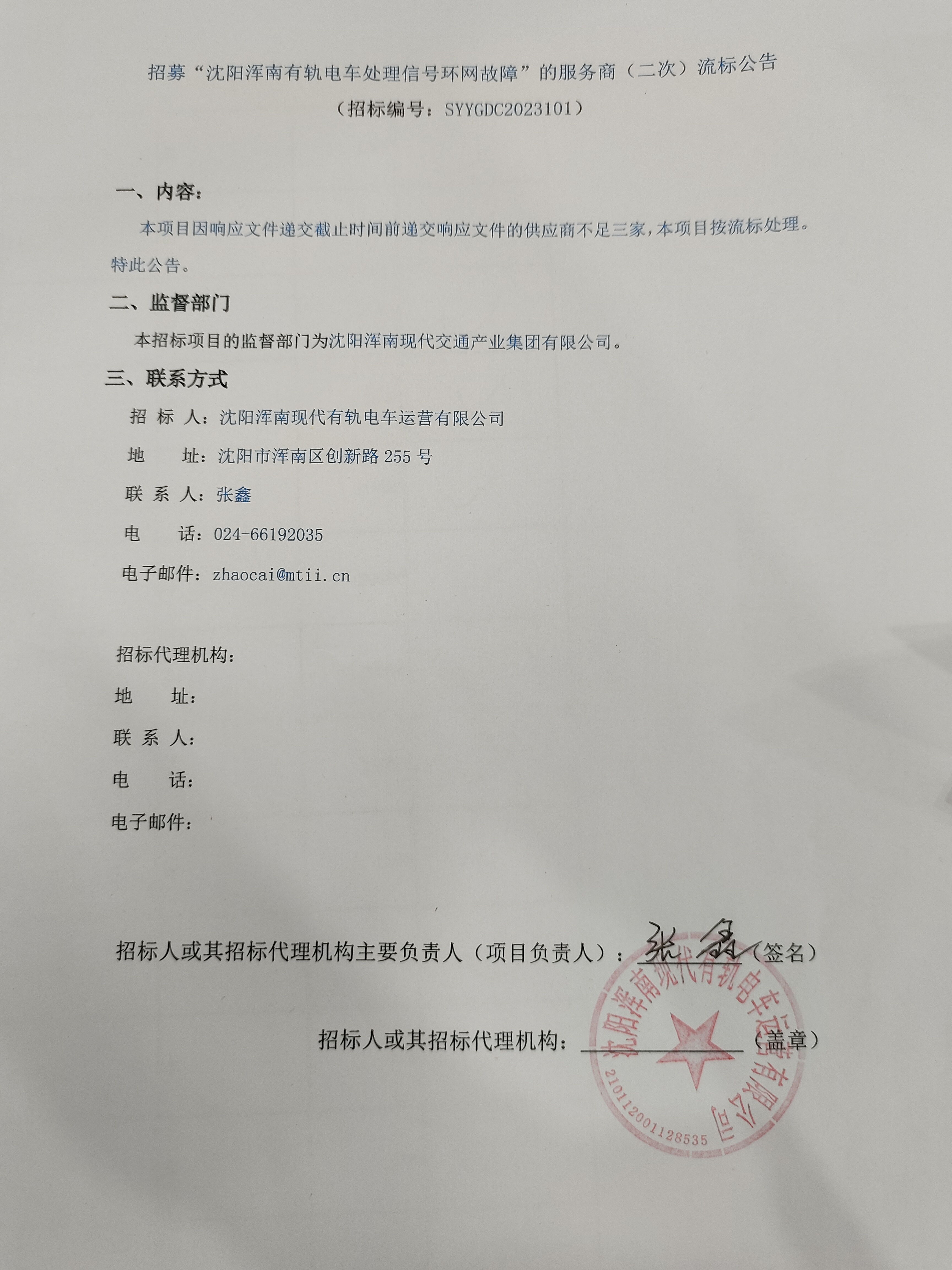 招募“沈阳浑南有轨电车处理信号环网故障”的服务商流标公告(二次)