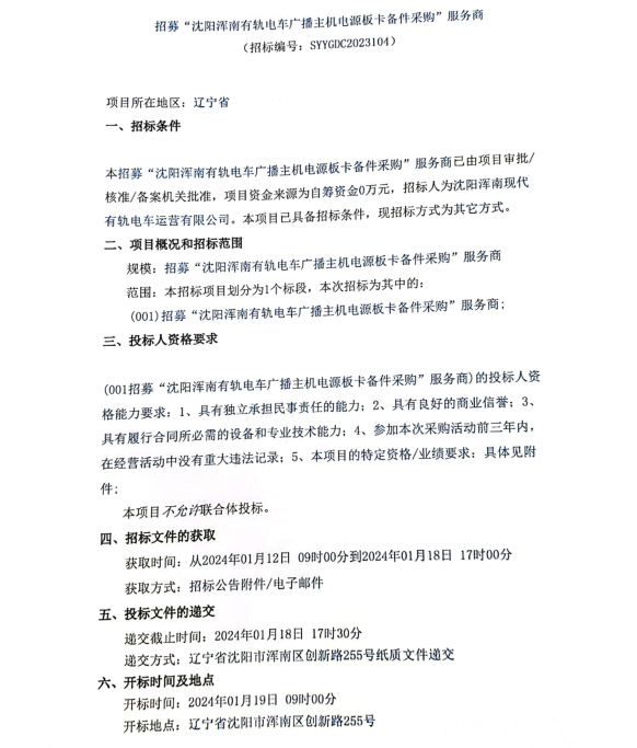 招采公告-招募“沈阳浑南有轨电车广播主机电源板卡备件采购”供应商