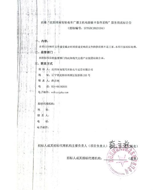 招募“沈阳浑南有轨电车广播主机电源板卡备件采购”服务商流标公告