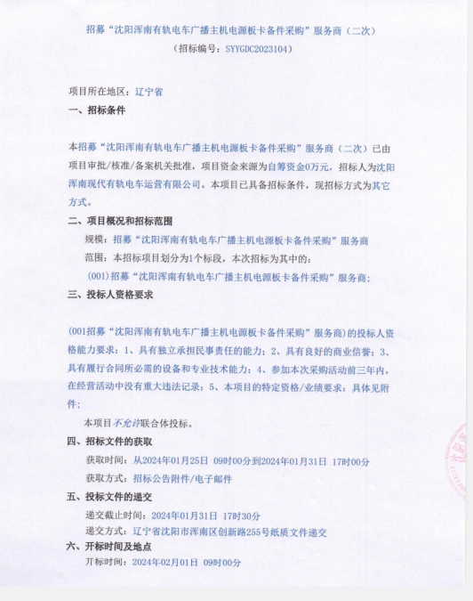 附件-招募“沈阳浑南有轨电车广播主机电源板卡备件采购”服务商