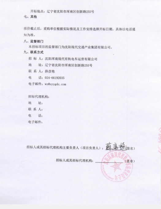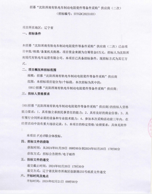 招采公告-招募“沈阳浑南有轨电车制动电阻瓷件等备件采购”供应商(二次)
