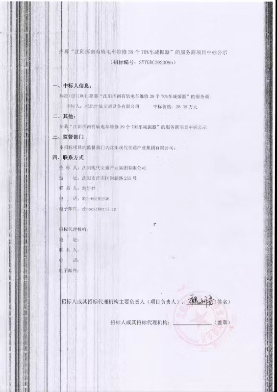招募“沈阳浑南有轨电车维修39个70%车减振器”的服务商项目中标公示