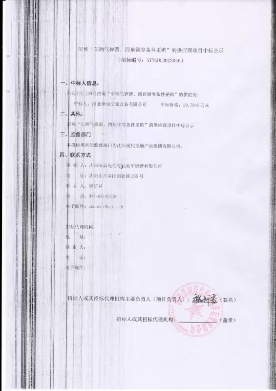 招募“车辆气弹簧、四角锁等备件采购”的供应商项目中标公示