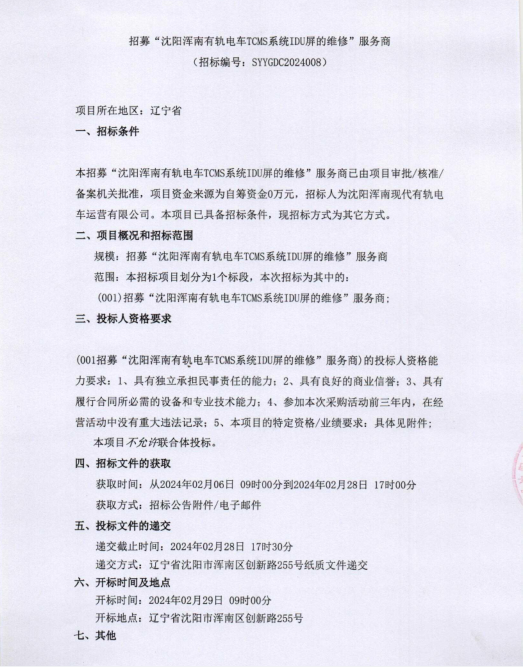 招采公告-招募“沈阳浑南有轨电车TCMS系统IDU屏的维修”服务商