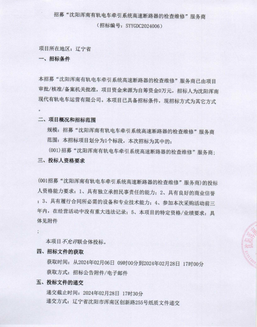 招采公告-招募“沈阳浑南有轨电车牵引系统高速断路器的检查维修”服务商