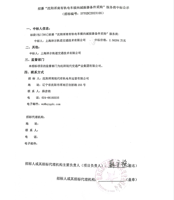 招募“沈阳浑南有轨电车横向减振器备件采购”服务商中标公示