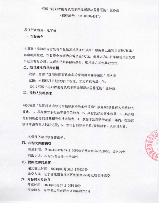 招采公告-招募“沈阳浑南有轨电车轮缘润滑块备件采购”服务商