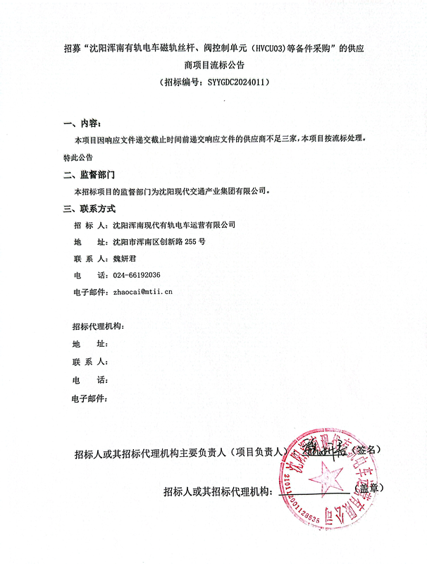 招募“沈阳浑南有轨电车磁轨丝杆、阀控制单元(HVCU03)等备件采购”的供应商项目流标公告
