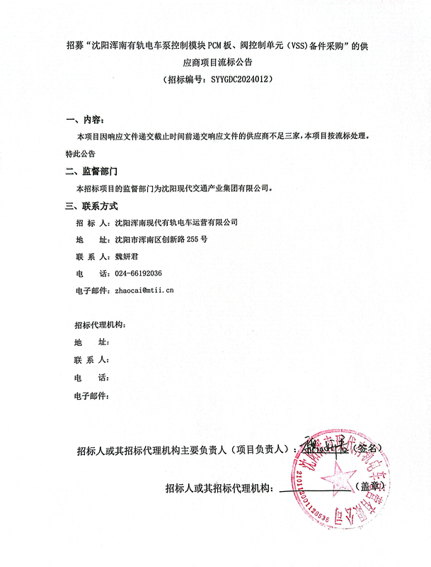 招募“沈阳浑南有轨电车泵控制模块PCM板、阀控制单元(VSS)备件采购”的供应商项目流标公告