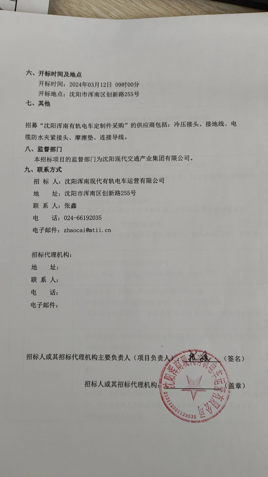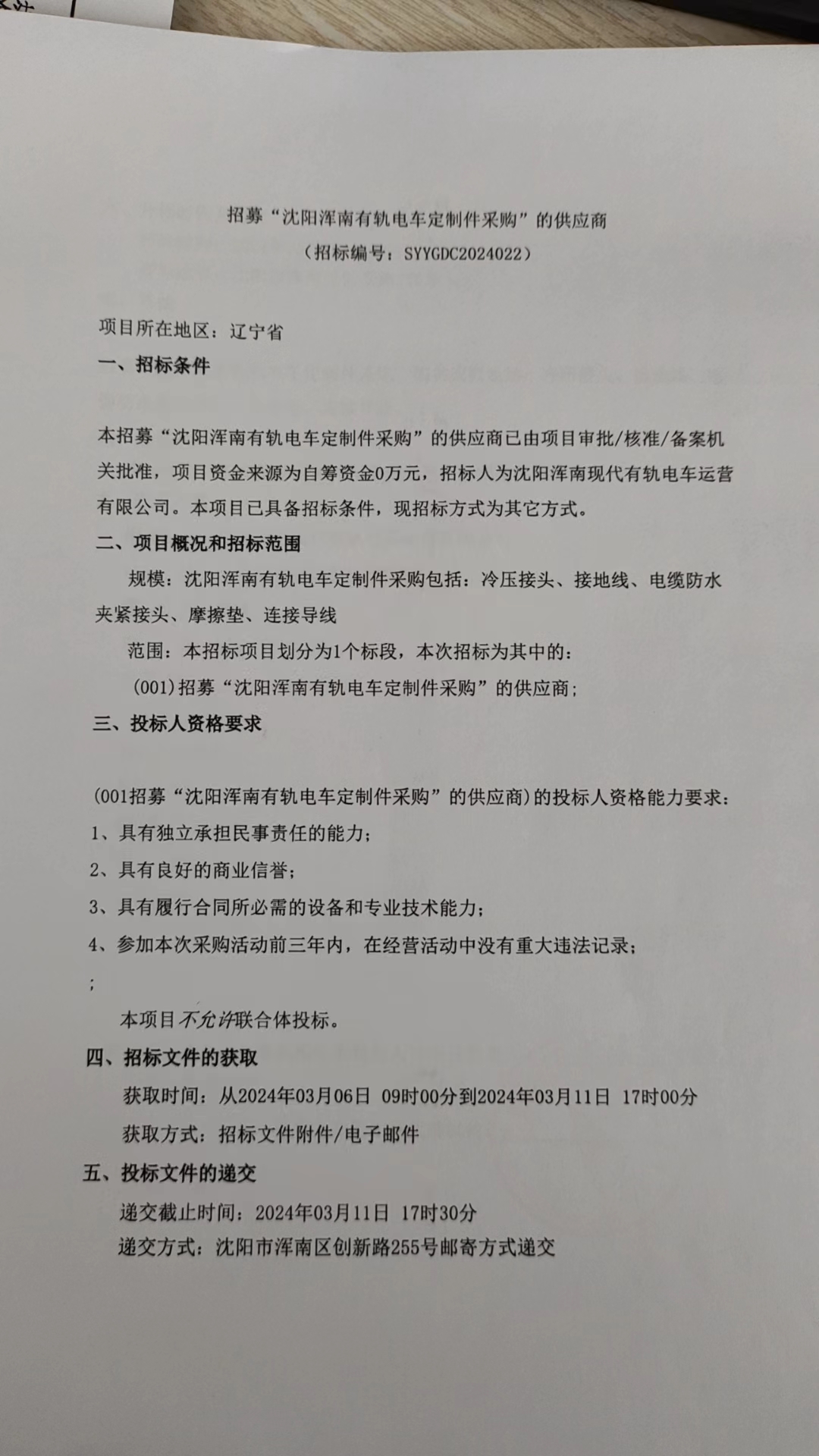 招采公告-招募“沈阳浑南有轨电车定制件采购”的供应商