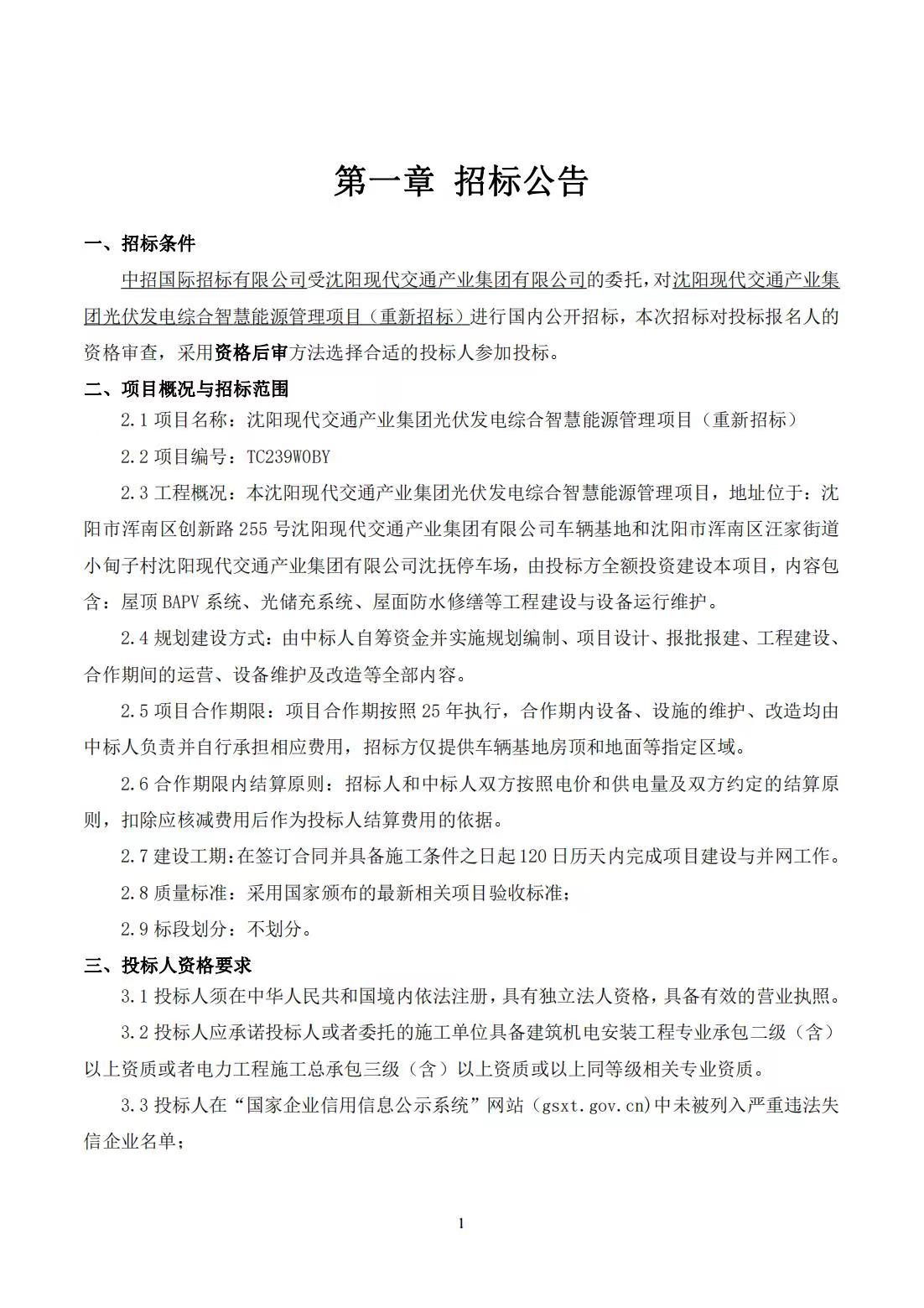 沈阳现代交通产业集团光伏发电综合智慧能源管理项目(重新招标)