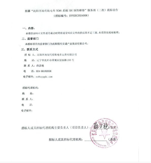 招募“沈阳浑南有轨电车TCMS系统IDU屏的维修”服务商(二次)流标公告