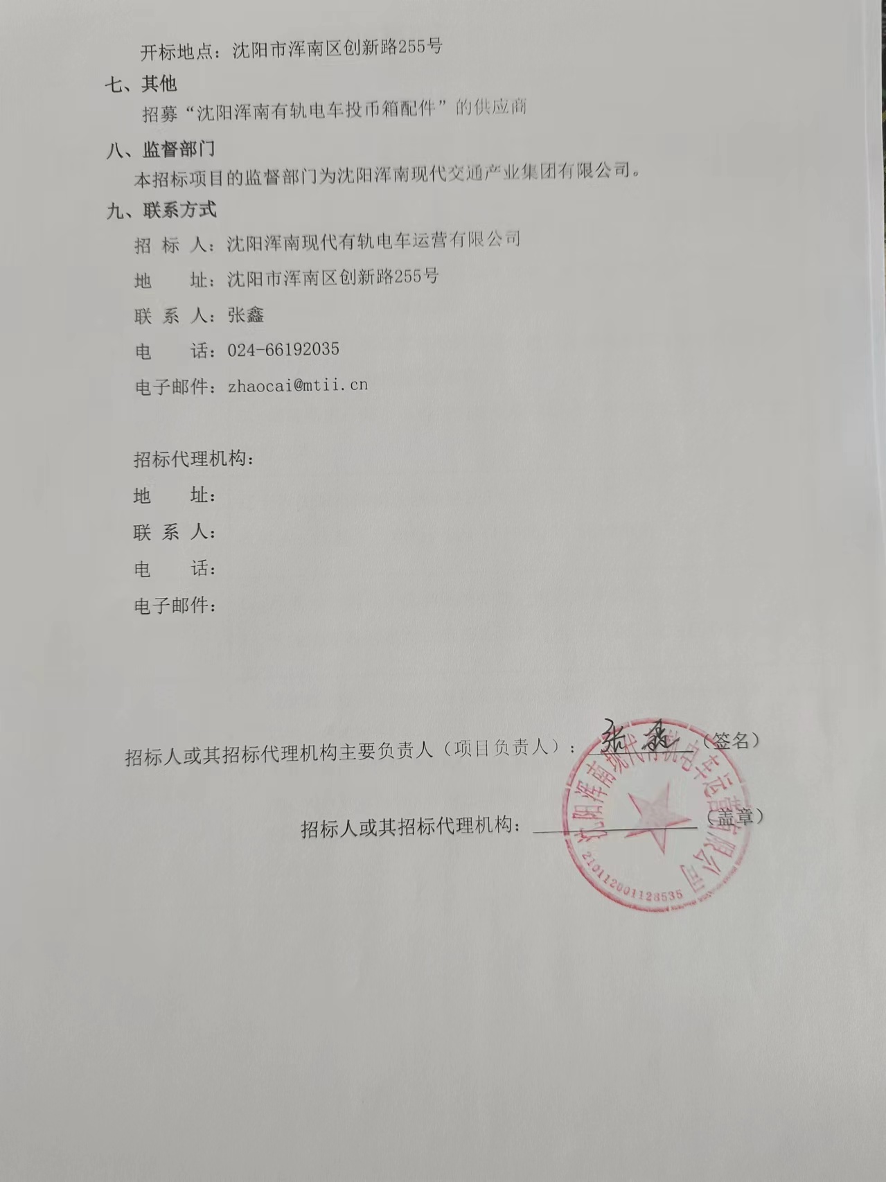 招采公告-招募“沈阳浑南有轨电车投币箱配件”的供应商