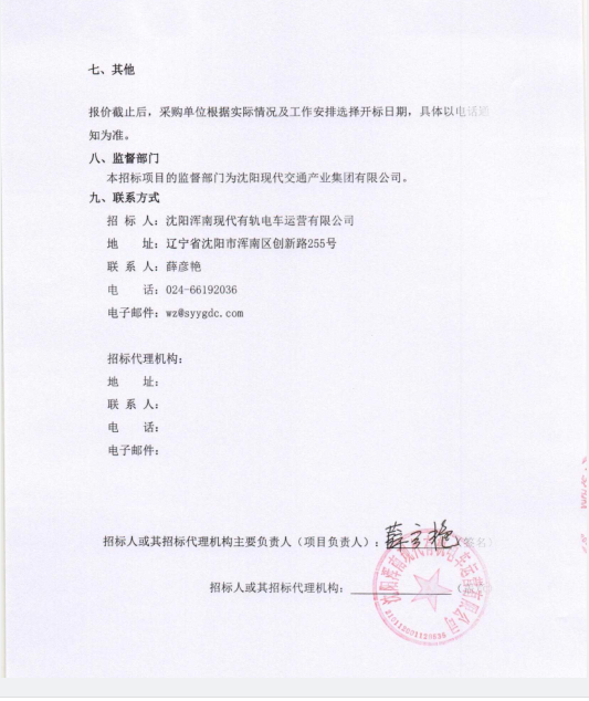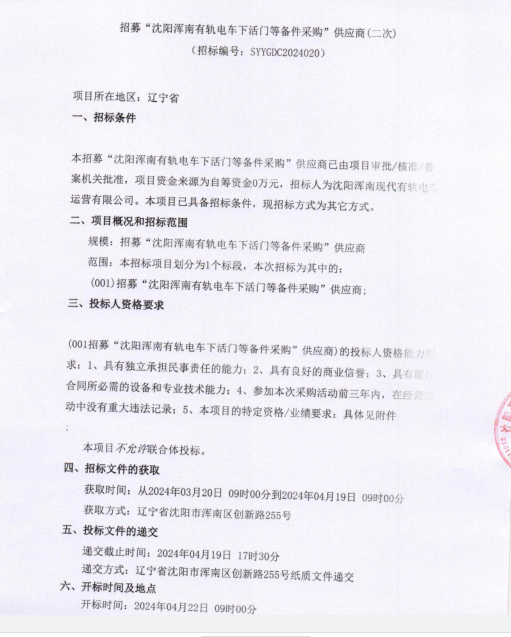 招采公告-招募“沈阳浑南有轨电车下活门等备件采购”供应商(二次)