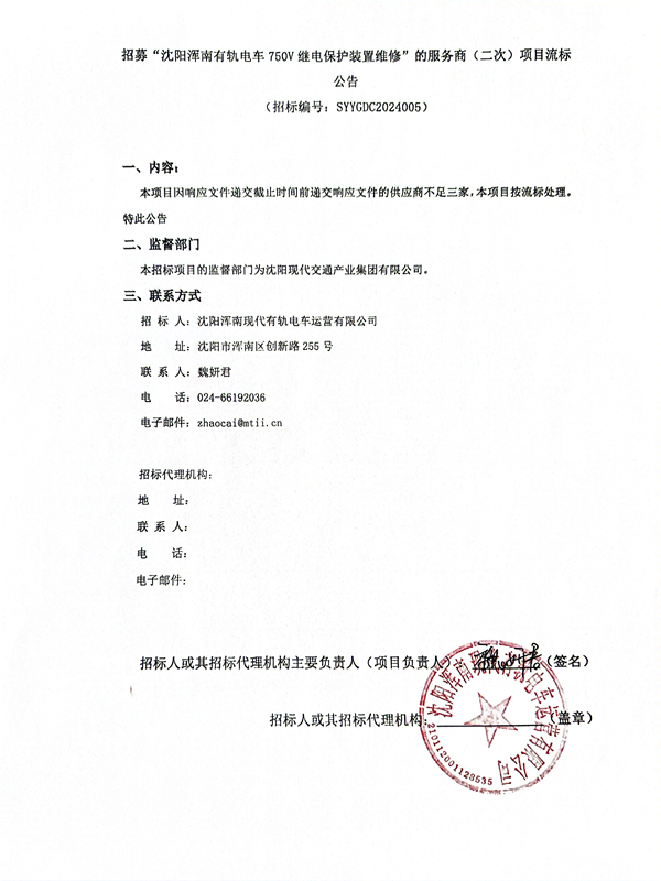 招募“沈阳浑南有轨电车750V继电保护装置维修”的服务商(二次)项目流标公告