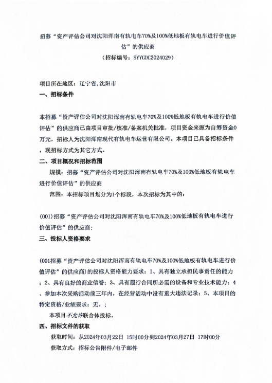 招采公告-招募“资产评估公司对沈阳浑南有轨电车70%及100%低地板有轨电车进行价值评估”的供应商