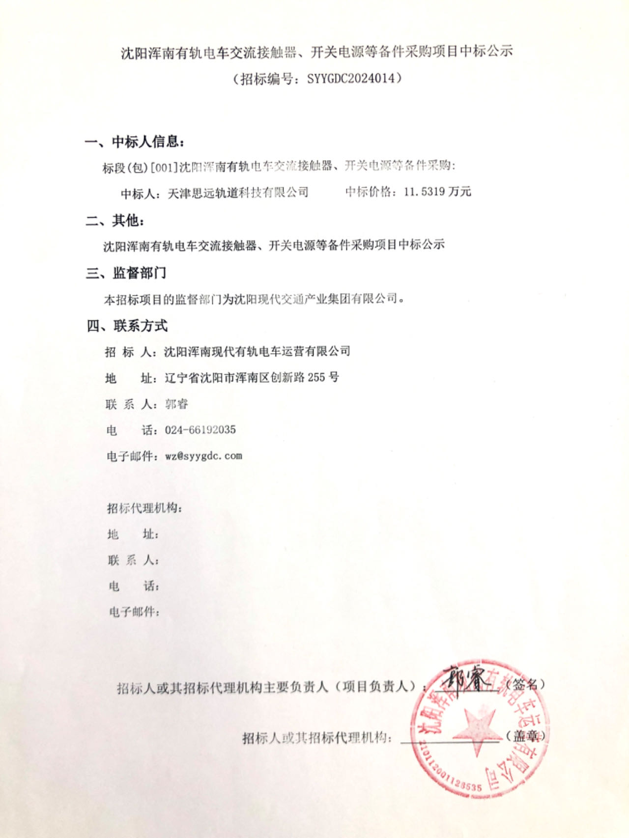 沈阳浑南有轨电车交流接触器、开关电源等备件采购项目中标公示