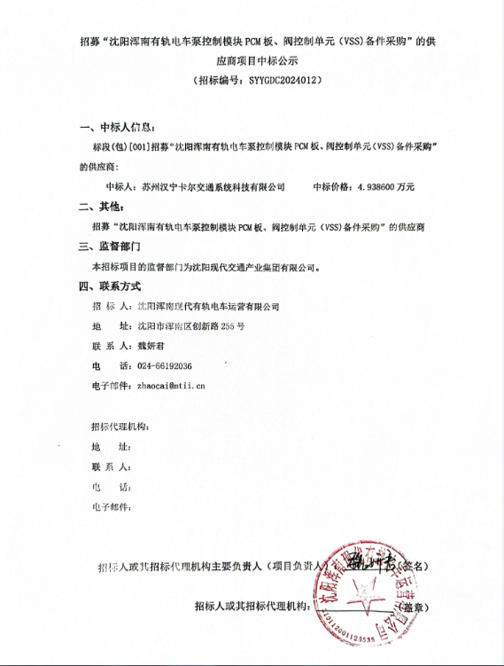 招募“沈阳浑南有轨电车泵控制模块PCM板、阀控制单元(VSS)备件采购”的供应商项目中标公示