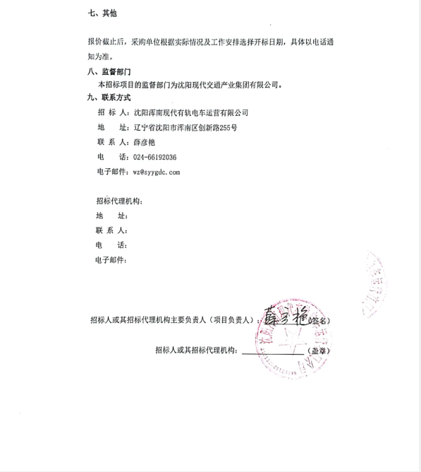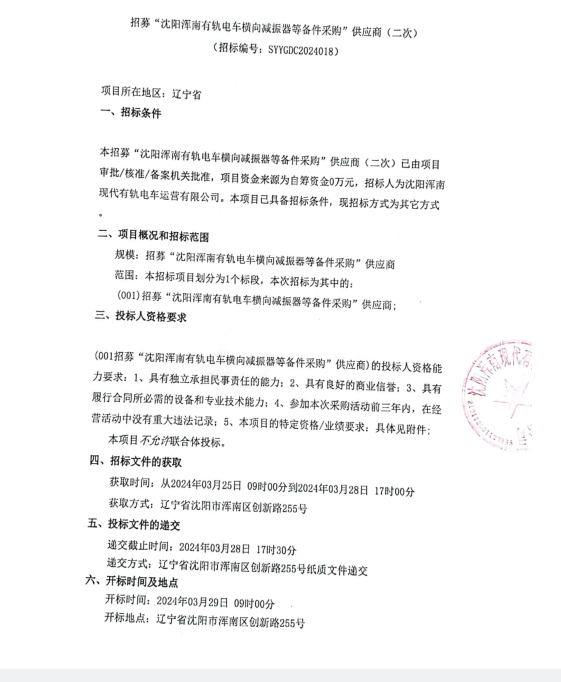 招采公告-招募“沈阳浑南有轨电车横向减振器等备件采购”供应商(二次)