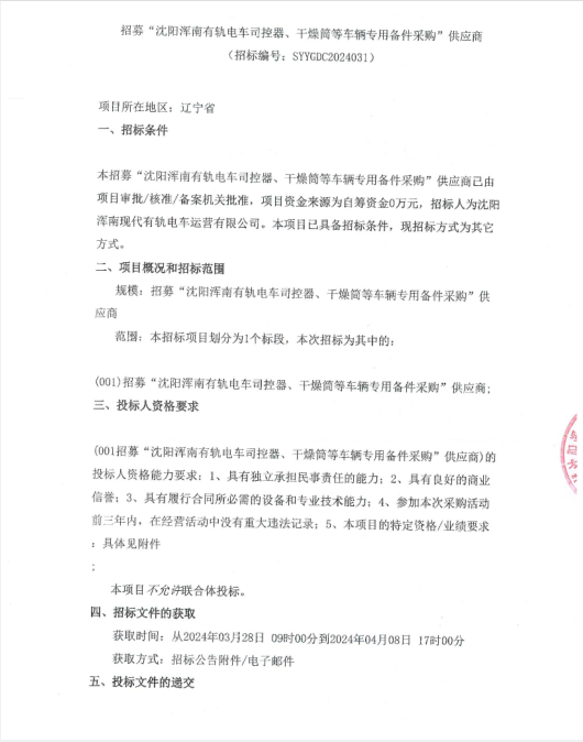招募“沈阳浑南有轨电车司控器、干燥筒等车辆专用备件采购”供应商