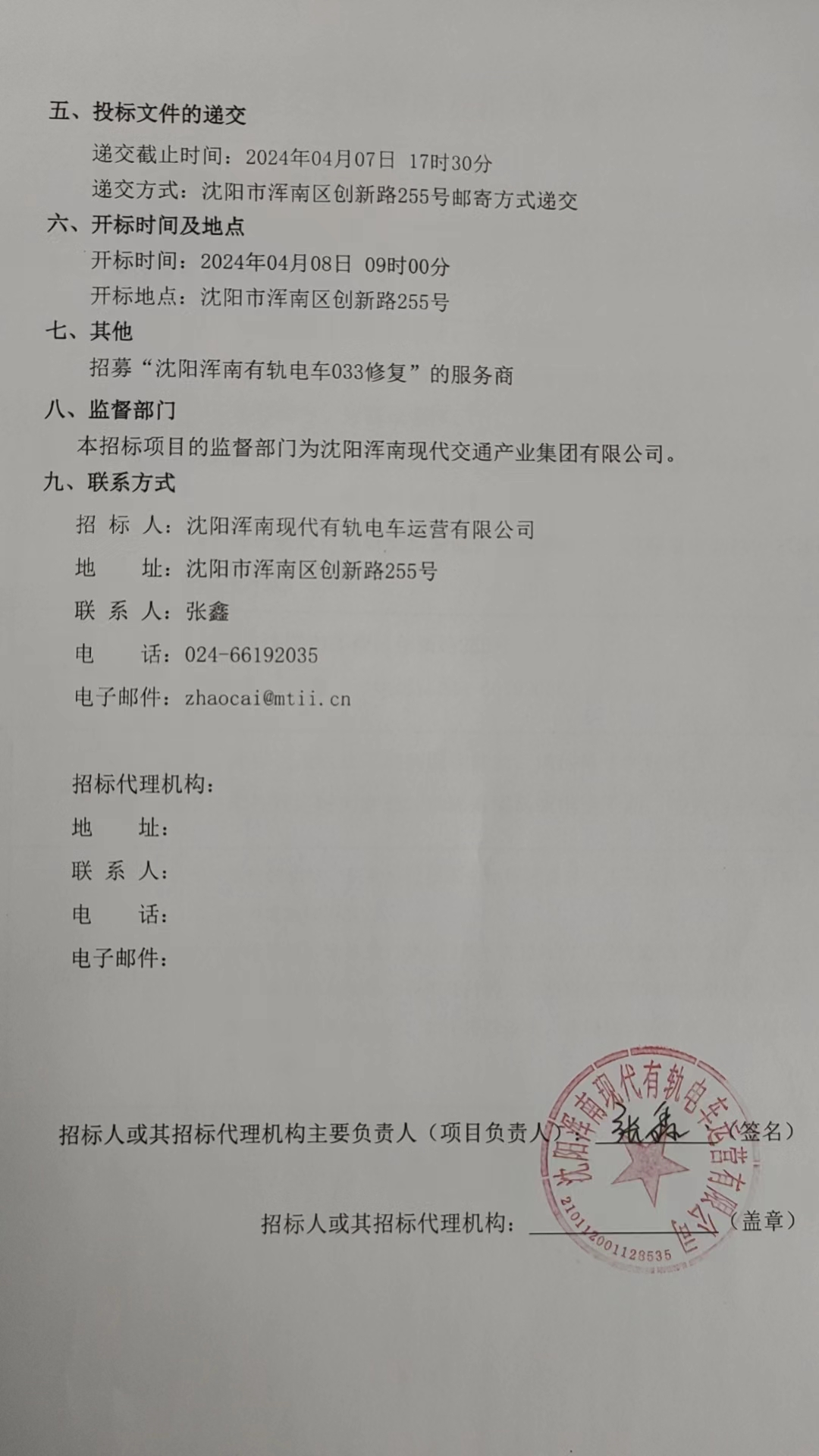 招采公告-招募“沈阳浑南有轨电车033修复”的服务商