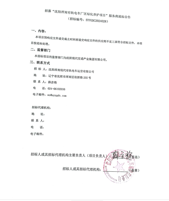 招募“沈阳浑南有轨电车厂区绿化养护项目”服务商流标公告