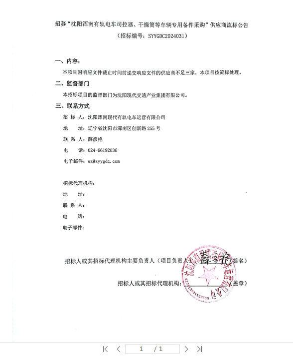 招募“沈阳浑南有轨电车司控器、干燥筒等车辆专用备件采购”供应商流标公告